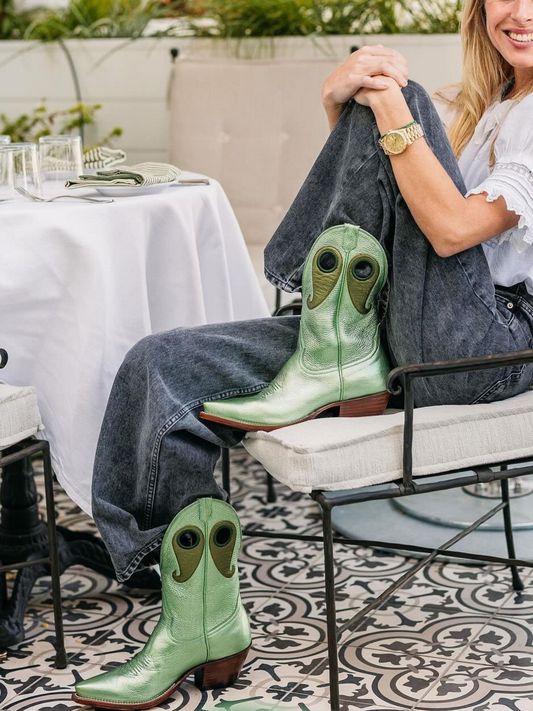 Metallic Green Crinkle Cutout Snip-Toe Mid Calf Cowgirl Boots With Olive Green Paisley