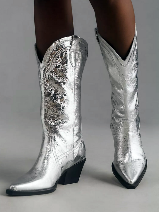 Cinkle Metallic Silver Pointed-Toe Wide Mid Calf Cowgirl Tall Boots