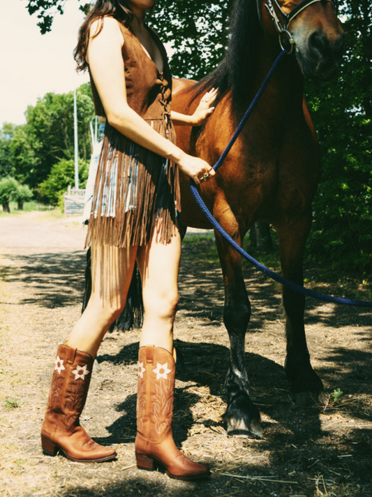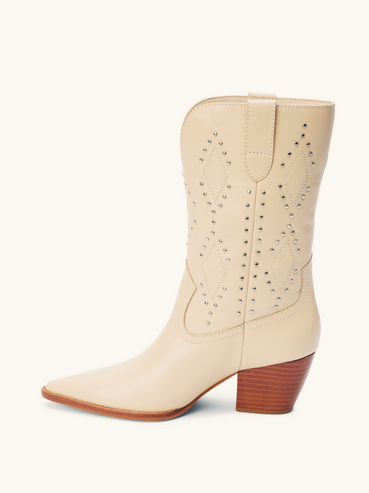 Ivory Stitch Studded Pointed-Toe Wide Mid Calf Western Boots Cowgirl Boots