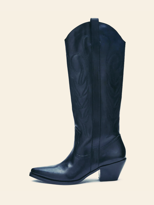 Black Embroidery Pointed-Toe Wide Mid Calf Cowgirl Boots Western Tall Boots