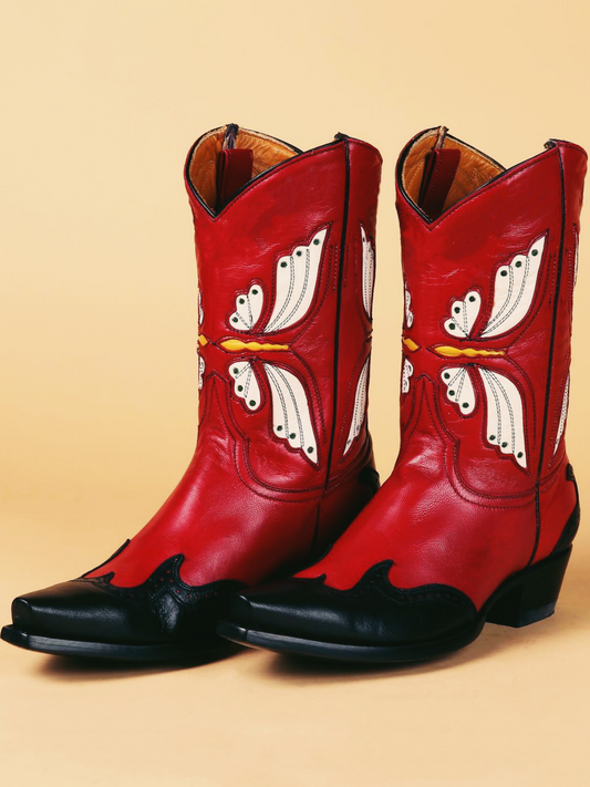 Red Snip-Toe AppliqueCowgirl Booties With White Butterfly Inlay