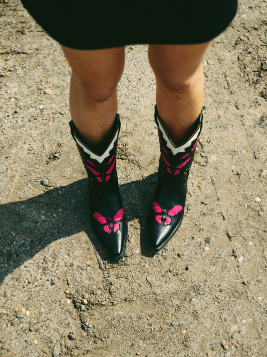 Black Pointed-Toe Mid Calf Western Boots Cowgirl Boots With Pink Butterfly Inlay