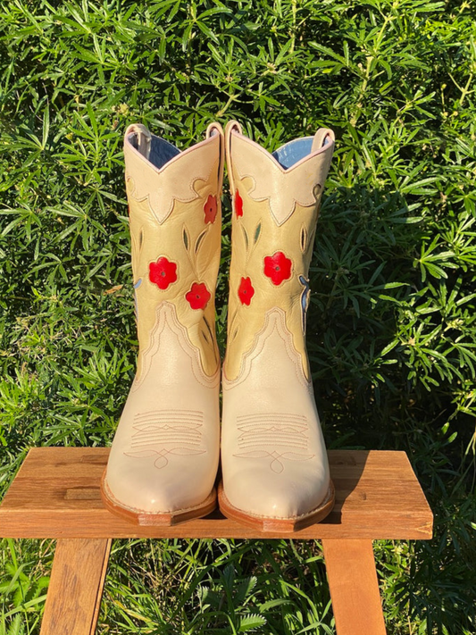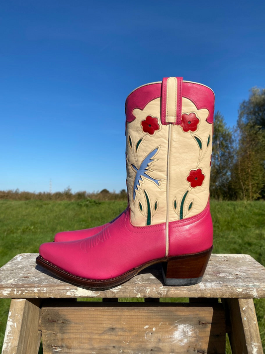 Contrast Pink And Beige Flowers Bird Inlay Mid Calf Cowgirl Boots