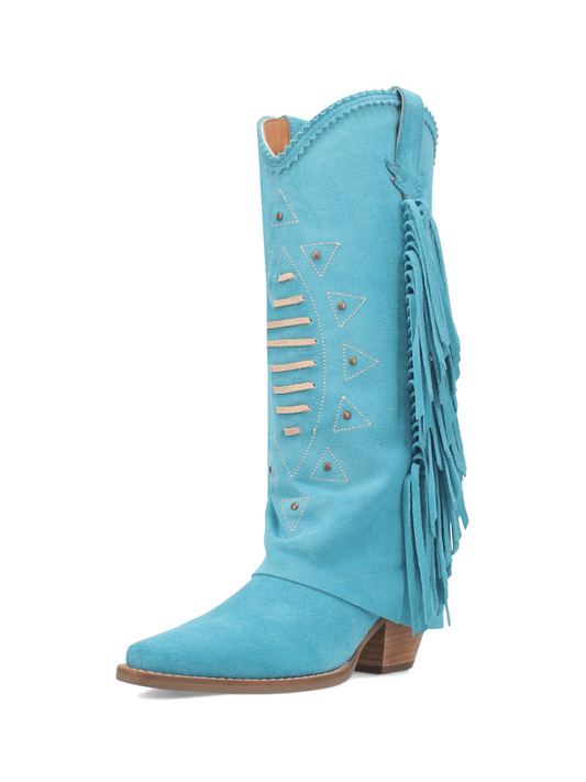 Fold-Over Faux Suede Snip-Toe Fringe Studded Running Stitch Wide Mid Calf Cowgirl Boots- Blue
