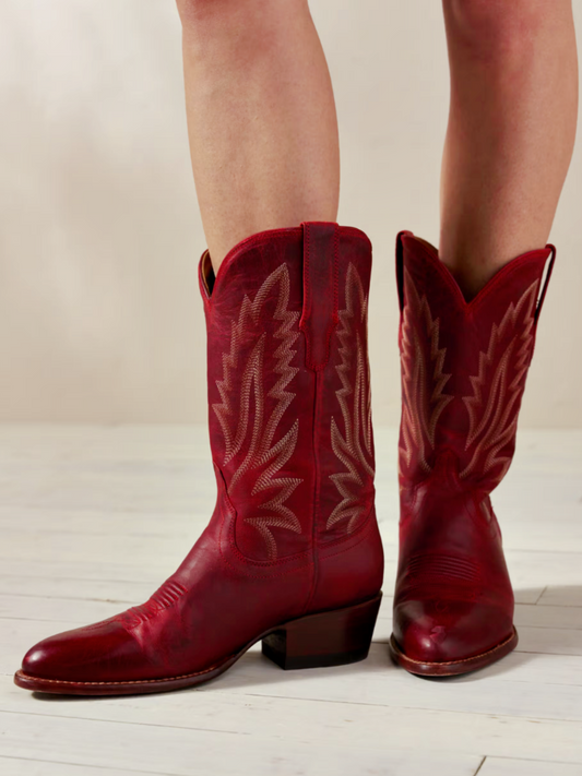 Distressed Redwood Almond-Toe Embroidery Mid Calf Cowgirl Boots