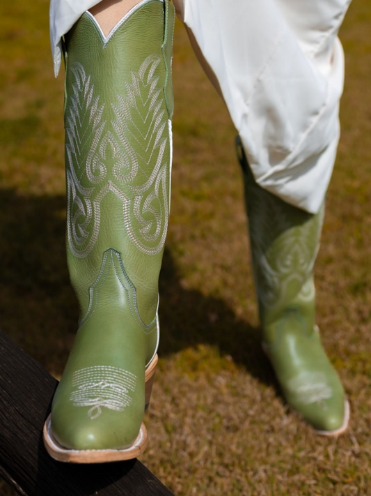 Green Snip-Toe Elegant Embroidery Wide Mid Calf Cowgirl Boots