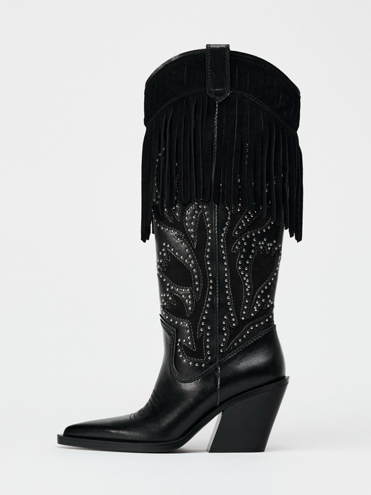 Black Pointed-Toe Faux Suede Fringe And Inlay Studded Wide Mid Calf Cowgirl Boots