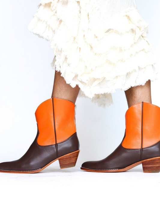 Contrast Chocolate And Orange Almond-Toe Back-Zip Mid Calf Cowgirl Boots