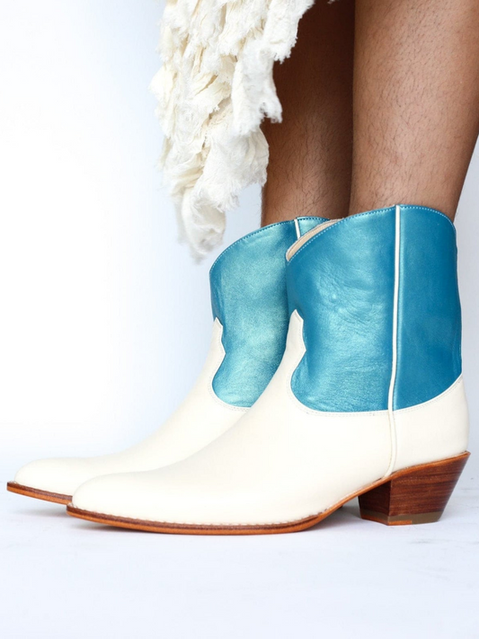Contrast Cream And Metallic Blue Almond-Toe Back-Zip Mid Calf Cowgirl Boots