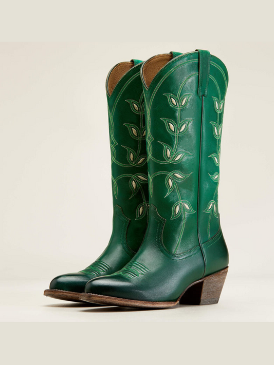 Green Floral Embroidery Almond-Toe Mid Calf Cowgirl Boots