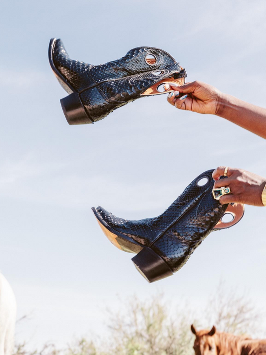 Black Snakeskin Paisley Cutout Snip-Toe Mid Calf Cowgirl Boots
