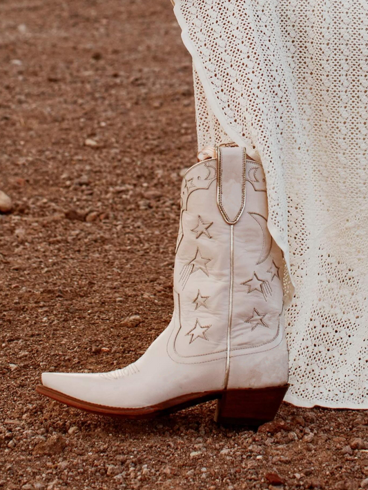 Moon Star Inlay Applique Mid Calf Cowgirl Boots - Cream