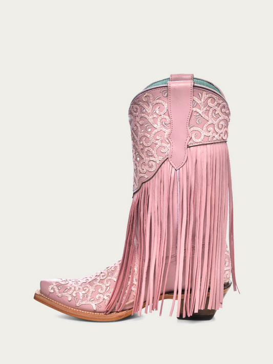 Blush Pink Snip-Toe Fringe Embroidery Filigree Glitter Applique Mid Calf Cowgirl Boots