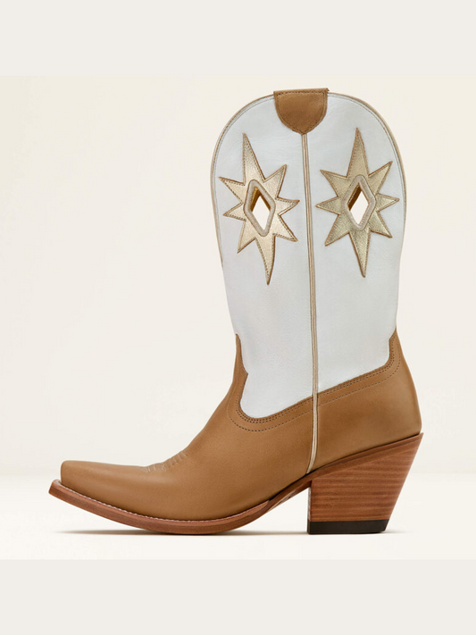 Metallic Star Applique Cut-Out Mid Calf Cowgirl Boots - Contrast Brown And Ivory