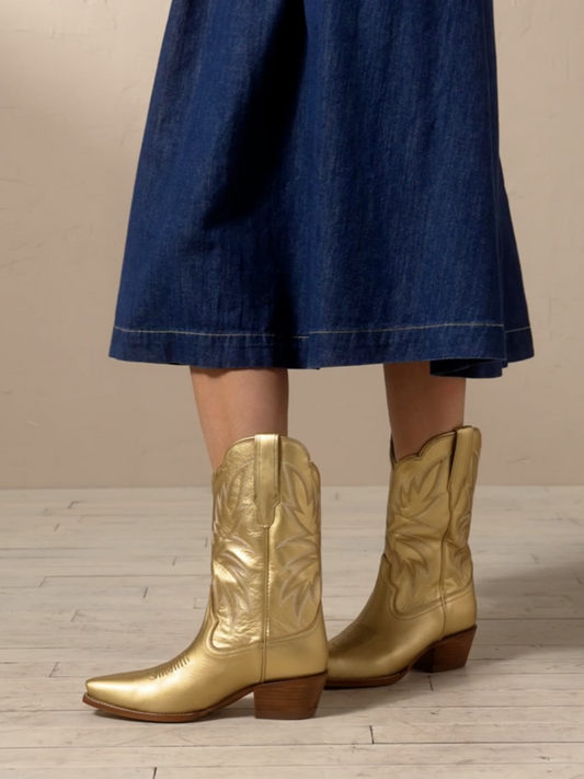 Retro Embroidery Snip-Toe Mid Calf Cowgirl Boots - Metallic Gold