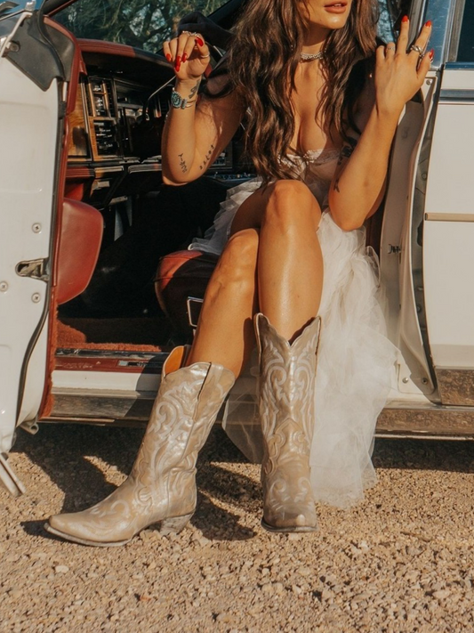 Vintage Metallic Silver Snip-Toe Embroidery Mid Calf Cowgirl Boots