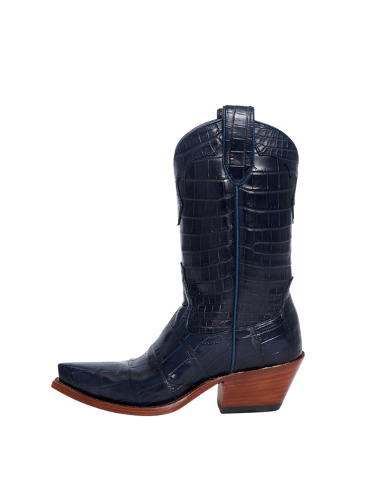 Snip-Toe Mid Calf Cowgirl Boots - Navy Blue Crocodile-Embossed Vegan Leather