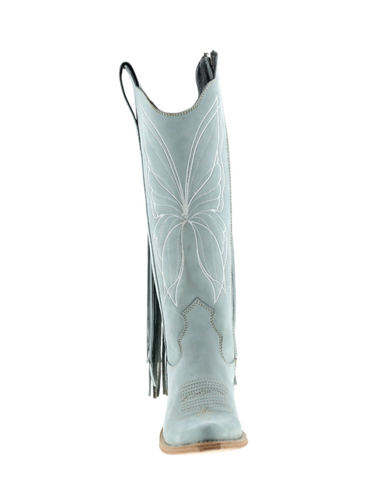 Gray Almond-Toe Butterfly Embroidery And Inlay Fringe Mid Calf Half-Zip Cowgirl Boots