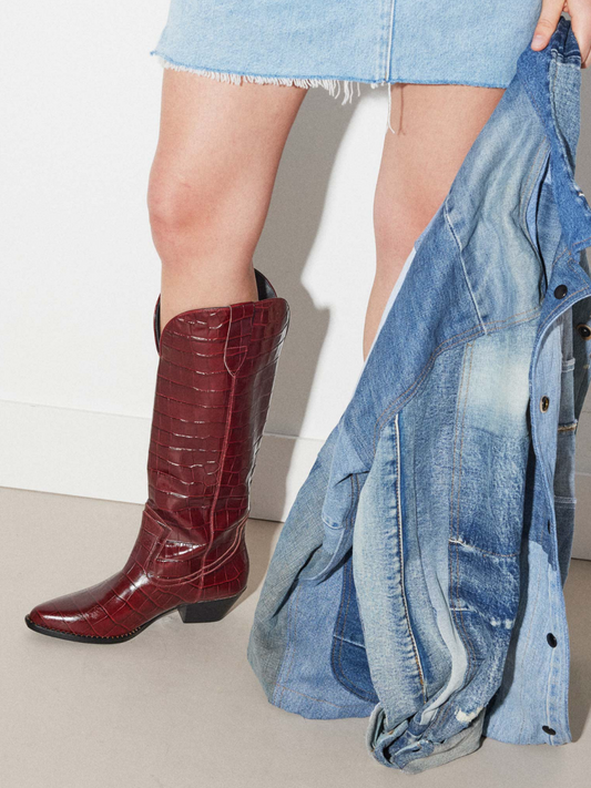 Cherry Red Crocodile-Embossed Snip-Toe Wide Mid Calf Cowgirl Boots