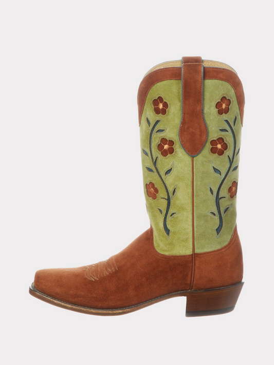 Floral Inlay Faux Suede Almond-Toe Wide Mid Calf Tall Cowgirl Boots - Contrast Green And Rust