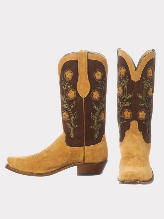 Floral Inlay Faux Suede Almond-Toe Wide Mid Calf Tall Cowgirl Boots - Contrast Brown And Tan