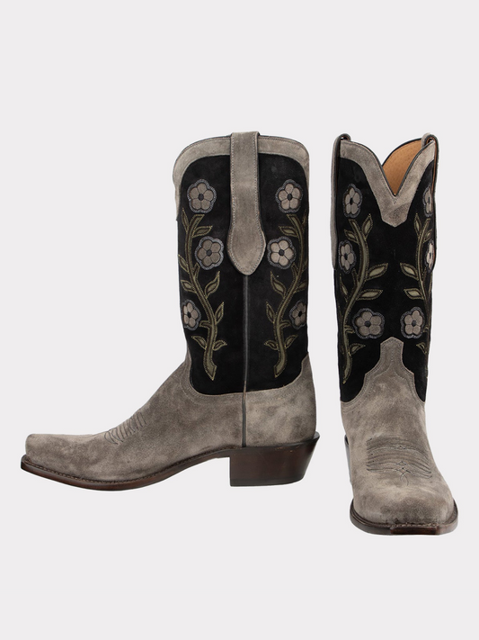 Floral Inlay Faux Suede Almond-Toe Wide Mid Calf Tall Cowgirl Boots - Contrast Black And Gray
