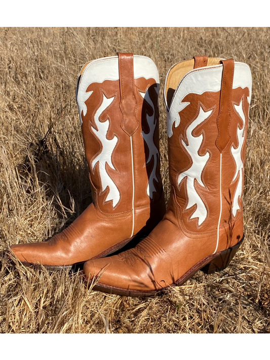 Tan Snip-Toe White Inlay And Applique Wide Mid Calf Tall Cowgirl Boots