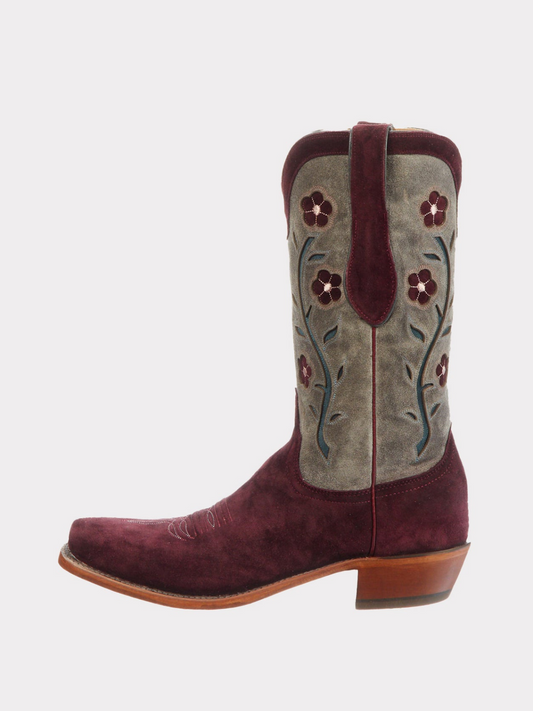 Floral Inlay Faux Suede Almond-Toe Wide Mid Calf Tall Cowgirl Boots - Contrast Burgundy And Gray