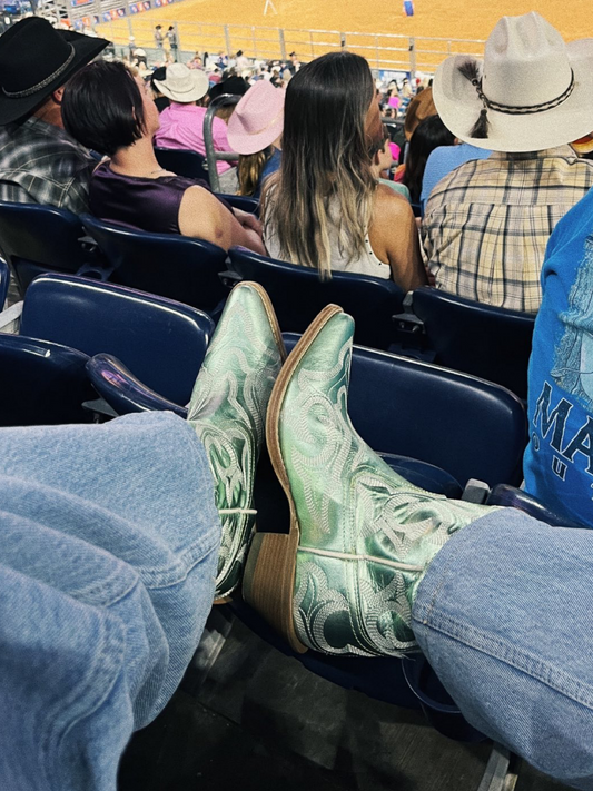 Embroidery Snip-Toe Wide Mid Calf Western Boots For Women - Metallic Mint Green