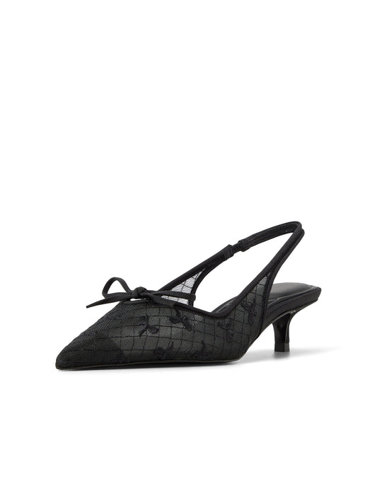 Black Mesh Pointed-Toe Front Bow And Bow Embroidery Slingback Kitten Heels