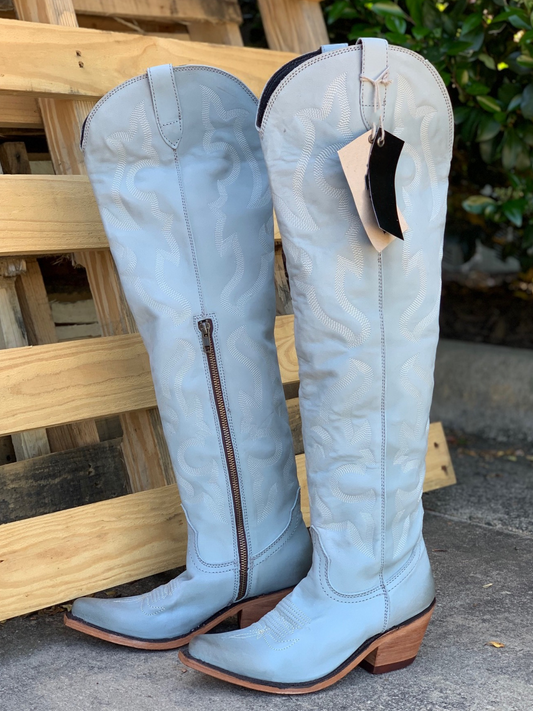 Light Blue Embroidery Pointed-Toe Half-Zip Over-The-Knee Cowgirl Boots