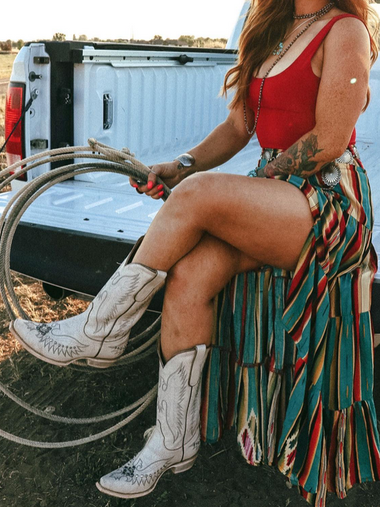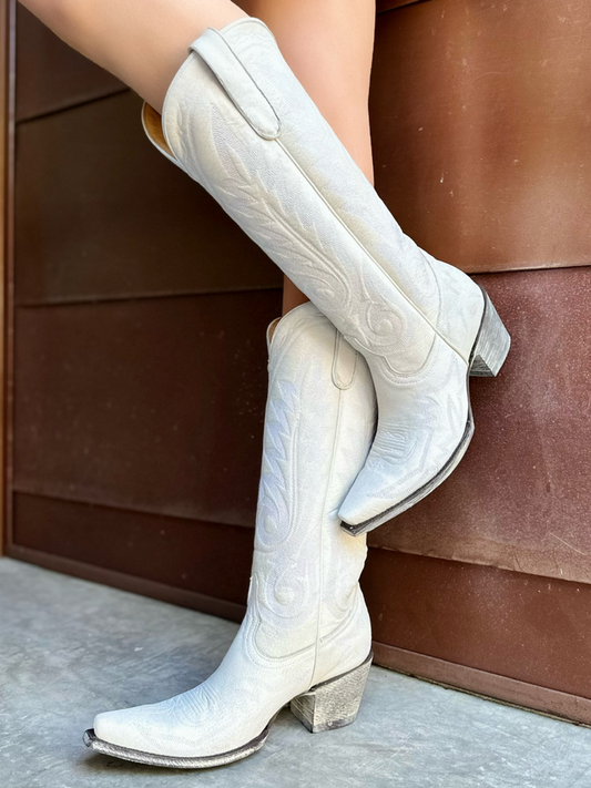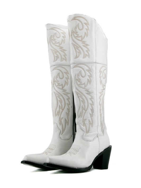 White Snip-Toe Classic Embroidery Wide Calf Cowgirl Knee High Boots