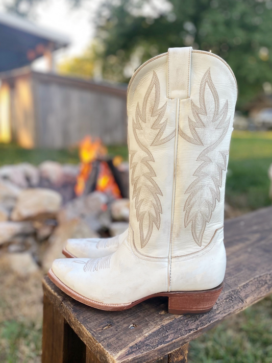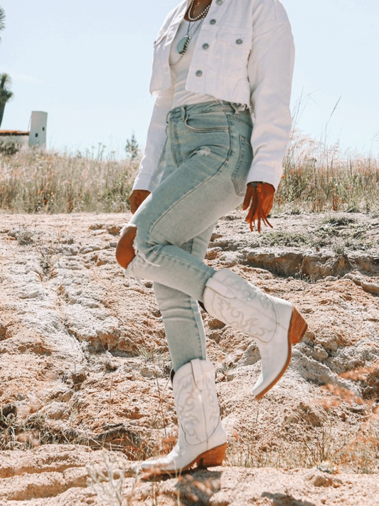 Distressed White Snip-Toe Embroidery Studded Wide Mid Calf Tall Cowgirl Boots