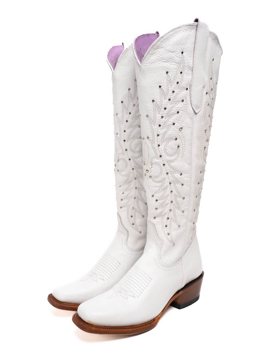 Studded Rhinestone Square-Toe Embroidery Half-Zip Tall Knee High Cowgirl Boots - White