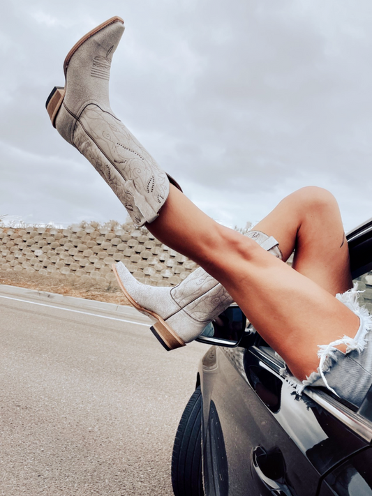 Snip-Toe Embroidery Tall Half-Zip Knee High Cowgirl Boots - White