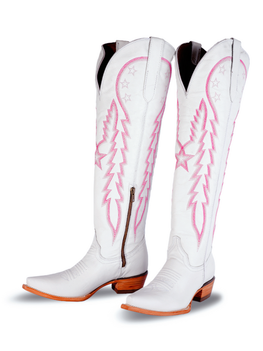 White Snip-Toe Pink Star Embroidery Half-Zip Tall Knee High Cowgirl Boots