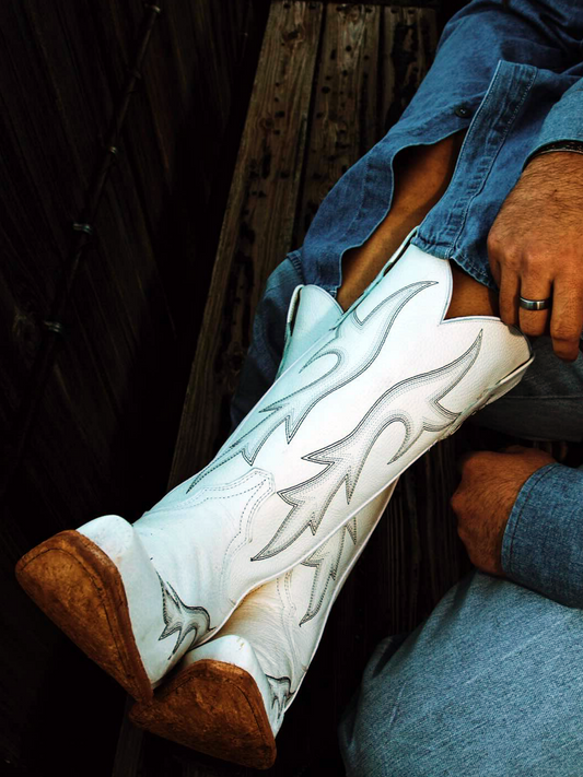 White Embroidery Snip-Toe Wide Calf Western Boots Vegan Leather Cowgirl Tall Boots