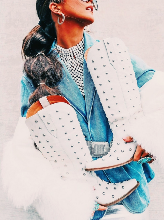 White Studded Pointed-Toe Mid Calf Western Tall Boots Cowgirl Boots