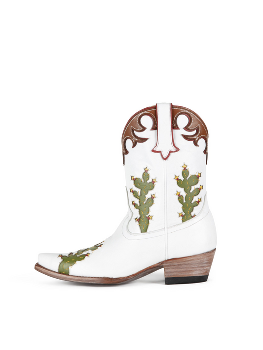 White Snip-Toe Wide Mid Calf Cowgirl Boots With Cactus Inlay And Applique
