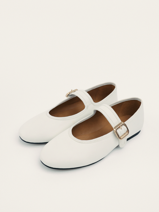 White Buckled Detailed Oval Ballet Flats Mary Janes With Wide Strap