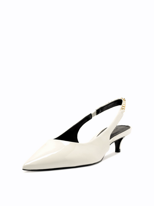 White Patent Pointy Kitten Heels Slingback Pumps With Chain Back Strap