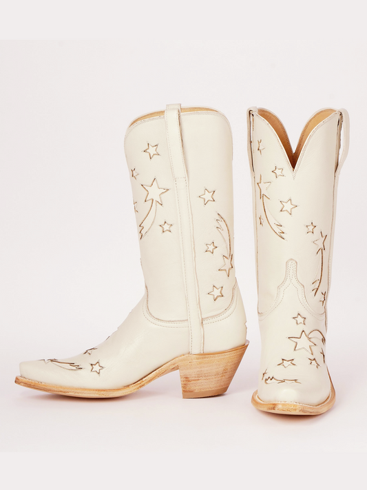Cream Snip-Toe Wide Mid Calf Western Boots Cowgirl Tall Boots With Star Inlay