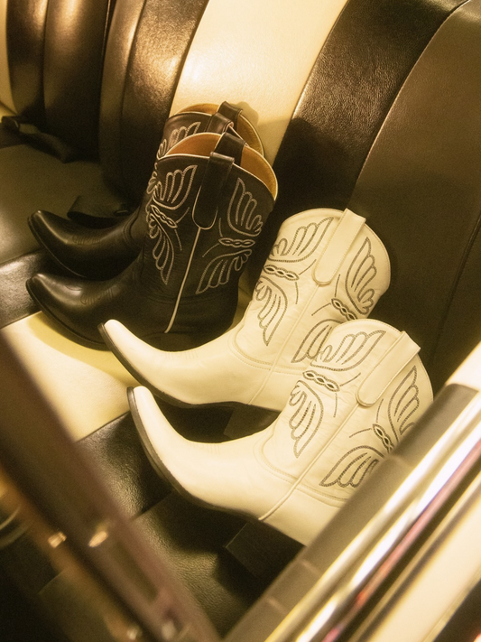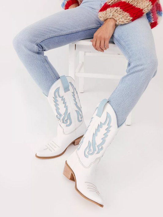 White Butterfly Embroidery Inlay Pointed-Toe Mid Calf Cowgirl Boots