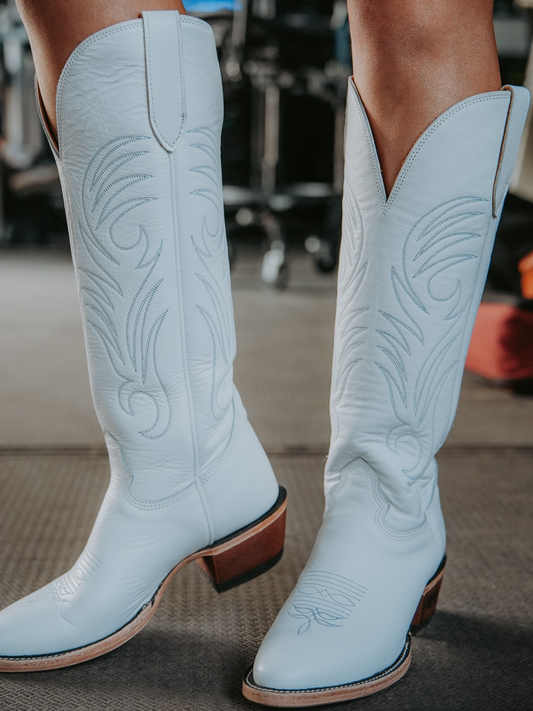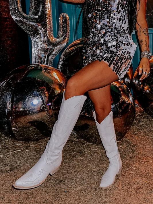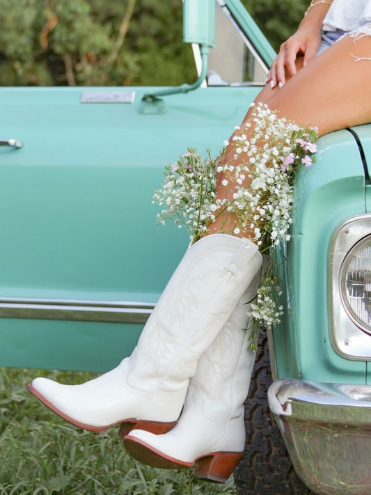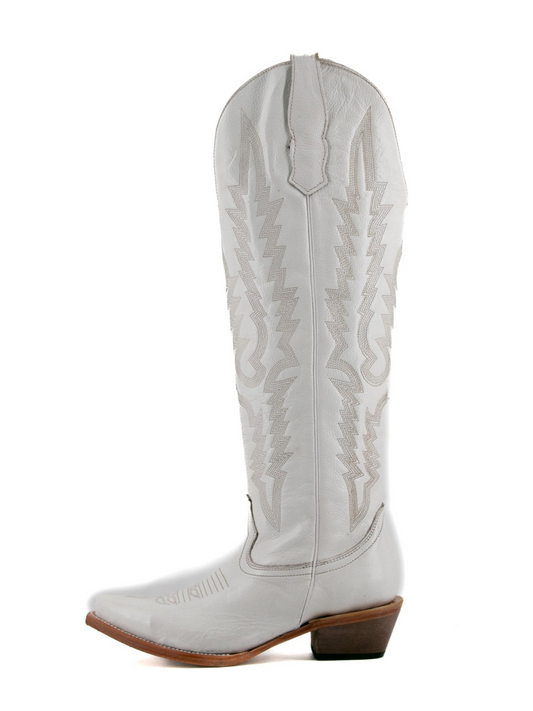 Classic Embroidery Snip-Toe Half-Zip Tall Knee High Cowgirl Boots - White