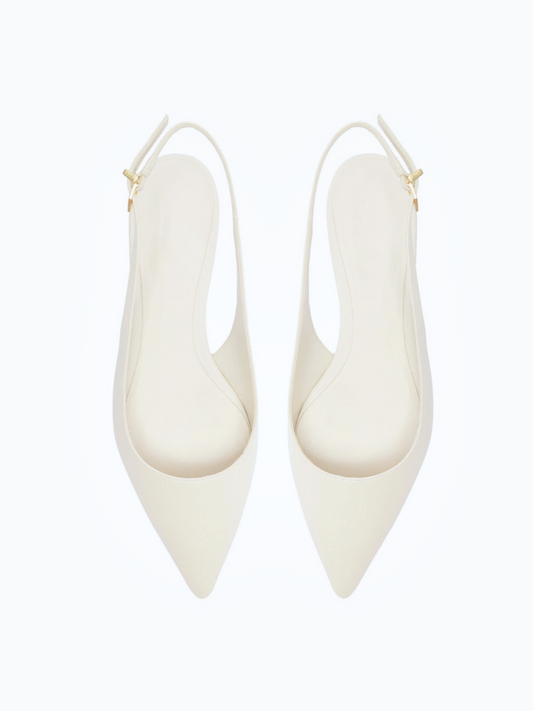 White Vegan Leather Pointy Flats Slingbacks With Buckled Back Strap