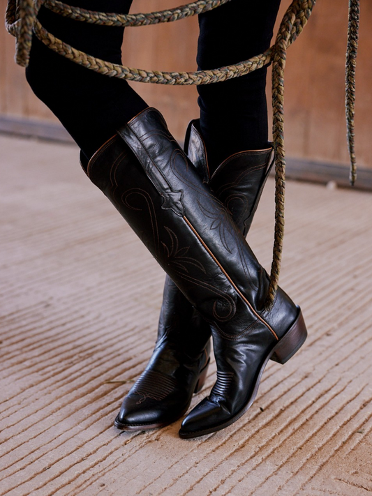Black Almond-Toe Embroidery Wide Calf Knee High Tall Western Boots For Women