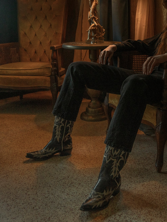 Black Embroidery Tall Wide Mid Calf Cowgirl Boots For Women