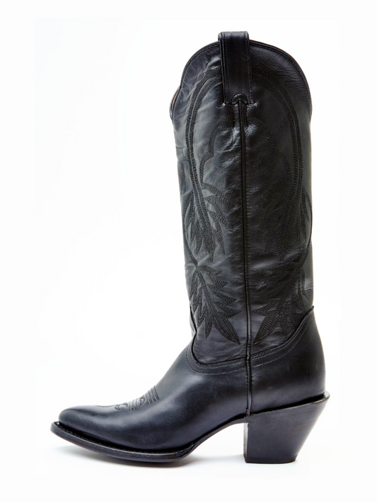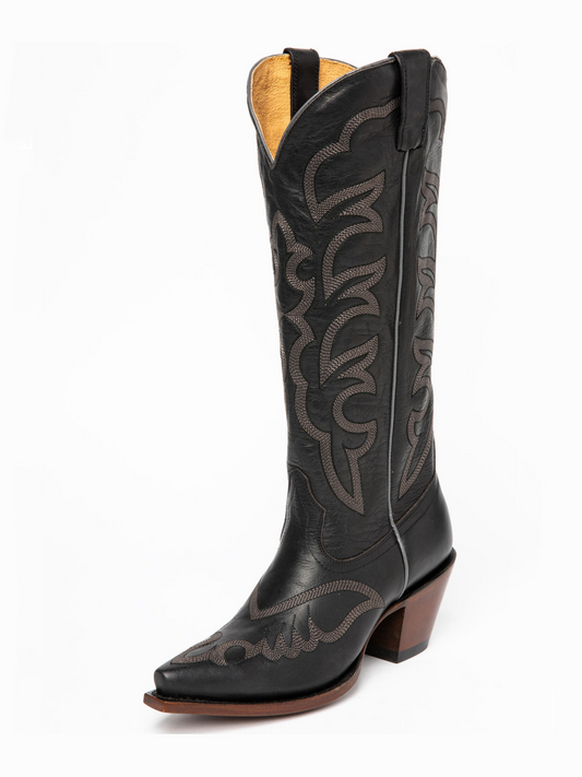 Black Embroidery Snip-Toe Tall Wide Mid Calf Cowgirl Boots For Women