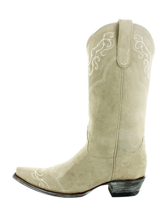 Beige Faux Suede Snip-Toe Embroidery Tall Wide Mid Calf Cowgirl Boots
