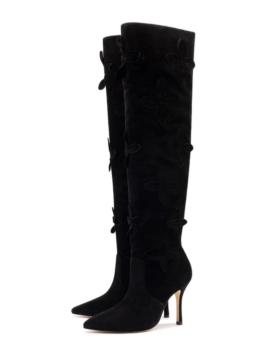 Black Faux Suede Pointed-Toe Floral Applique Wide Calf Over-The-Knee Tall Stiletto Boots